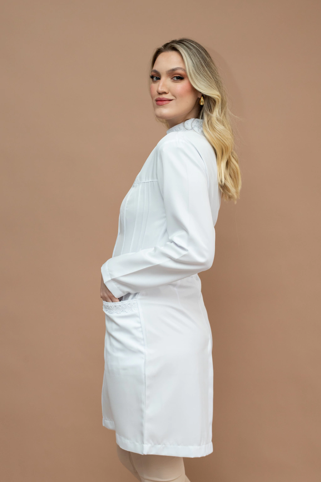 Apresentamos o Jaleco Acinturado com Nervura e Guipir - Branco, a escolha perfeita para profissionais que desejam unir elegância e conforto em seu dia a dia. Com uma modelagem super slim, este jaleco valoriza a silhueta feminina, garantindo um caimento impecável que exala sofisticação.