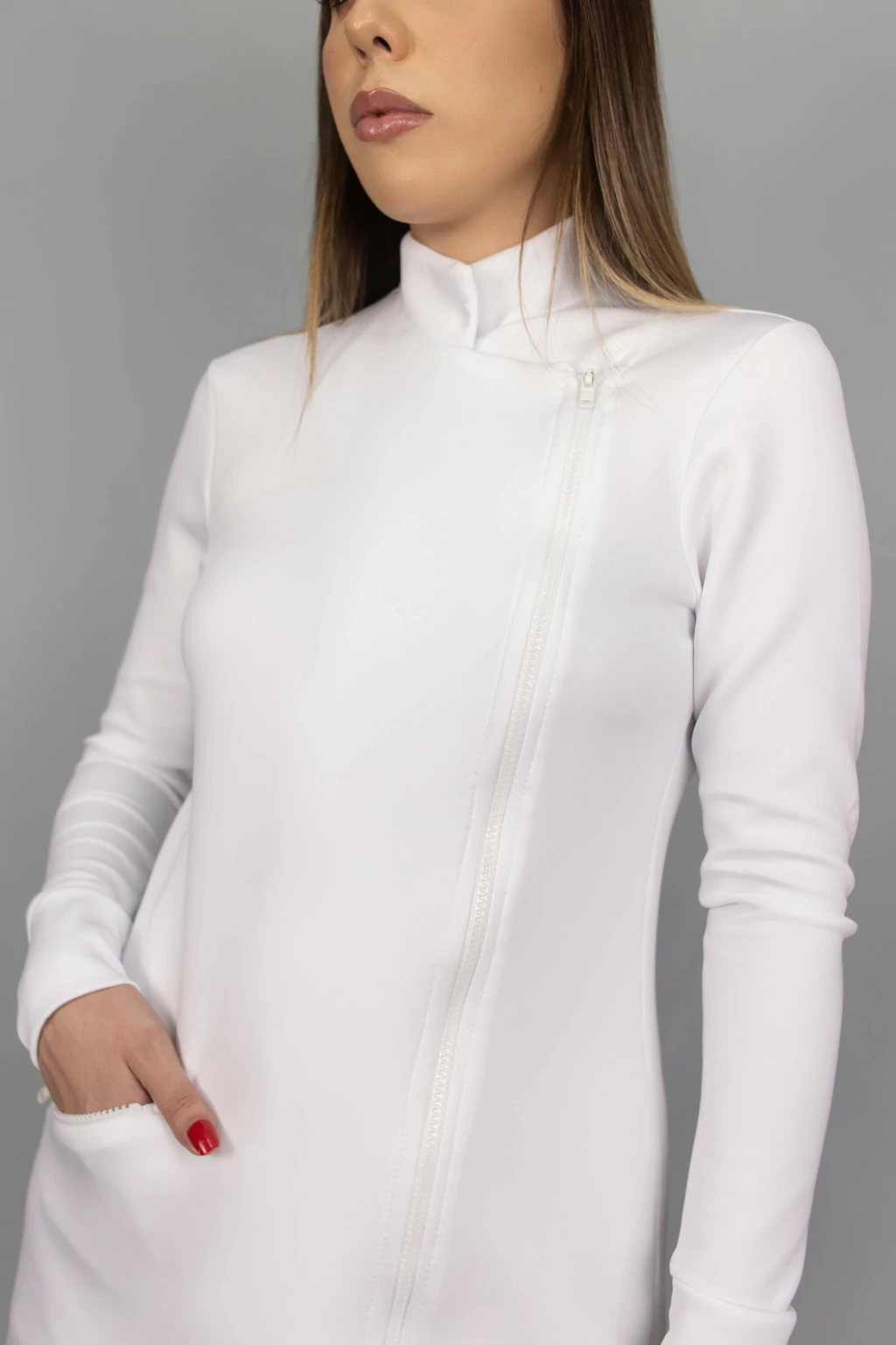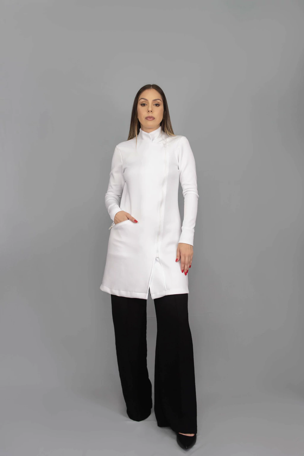 Jaleco acinturado confeccionado em tecido tecnológico poliamida e elastano importado.